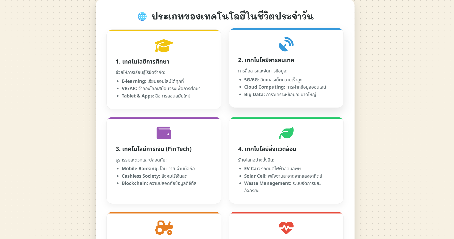 "1. เพื่อให้ผู้เรียนสามารถบอกความหมายและจำแนก ประเภทของเทคโนโลยี ทั้ง 6 ด้าน (การศึกษา, สารสนเทศ, การเงิน, สิ่งแวดล้อม, การเกษตร, การแพทย์) ได้อย่างถูกต้อง 2. เพื่อให้ผู้เรียนยกตัวอย่างเทคโนโลยีในชีวิตประจำวันได้สอดคล้องกับประเภทต่างๆ"