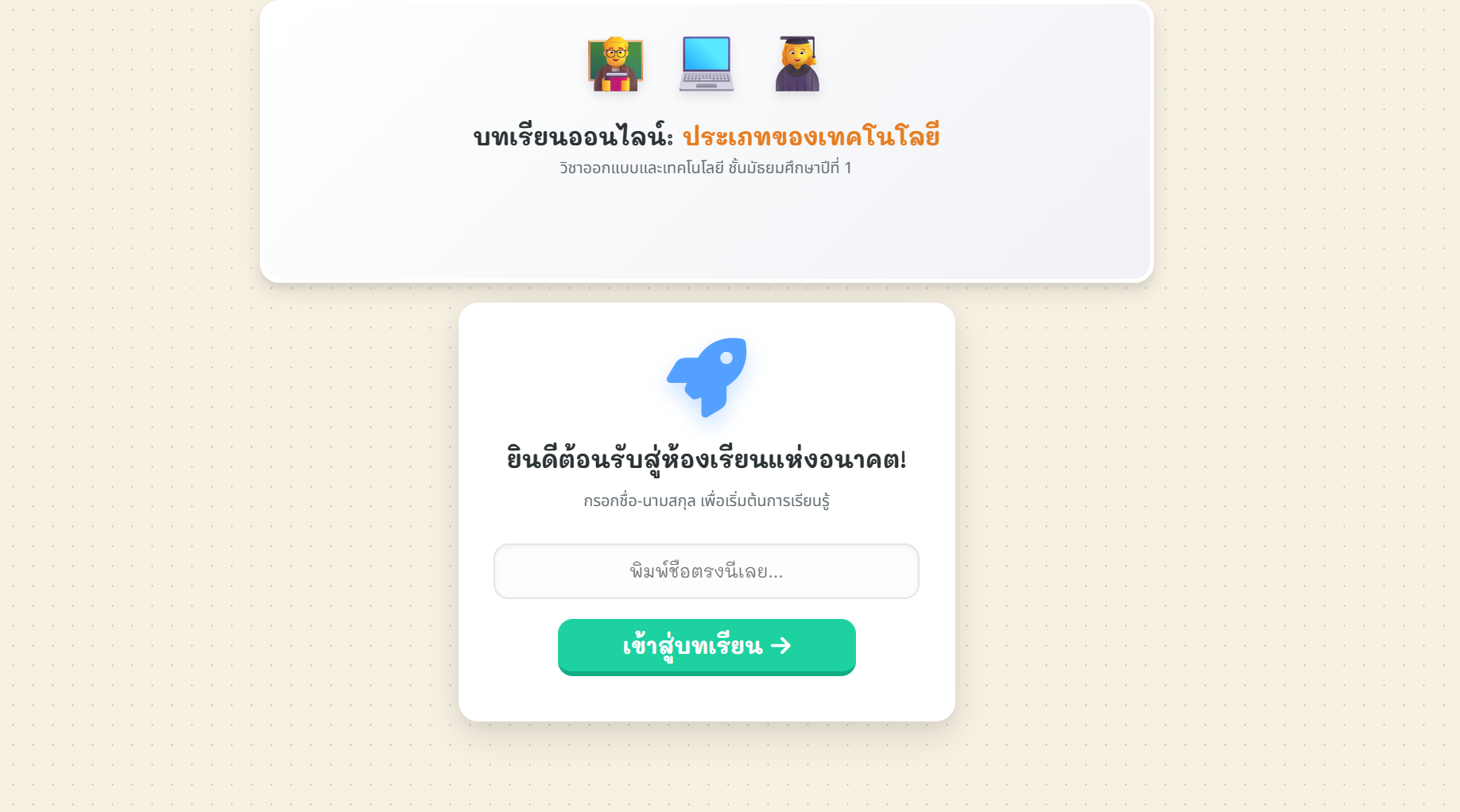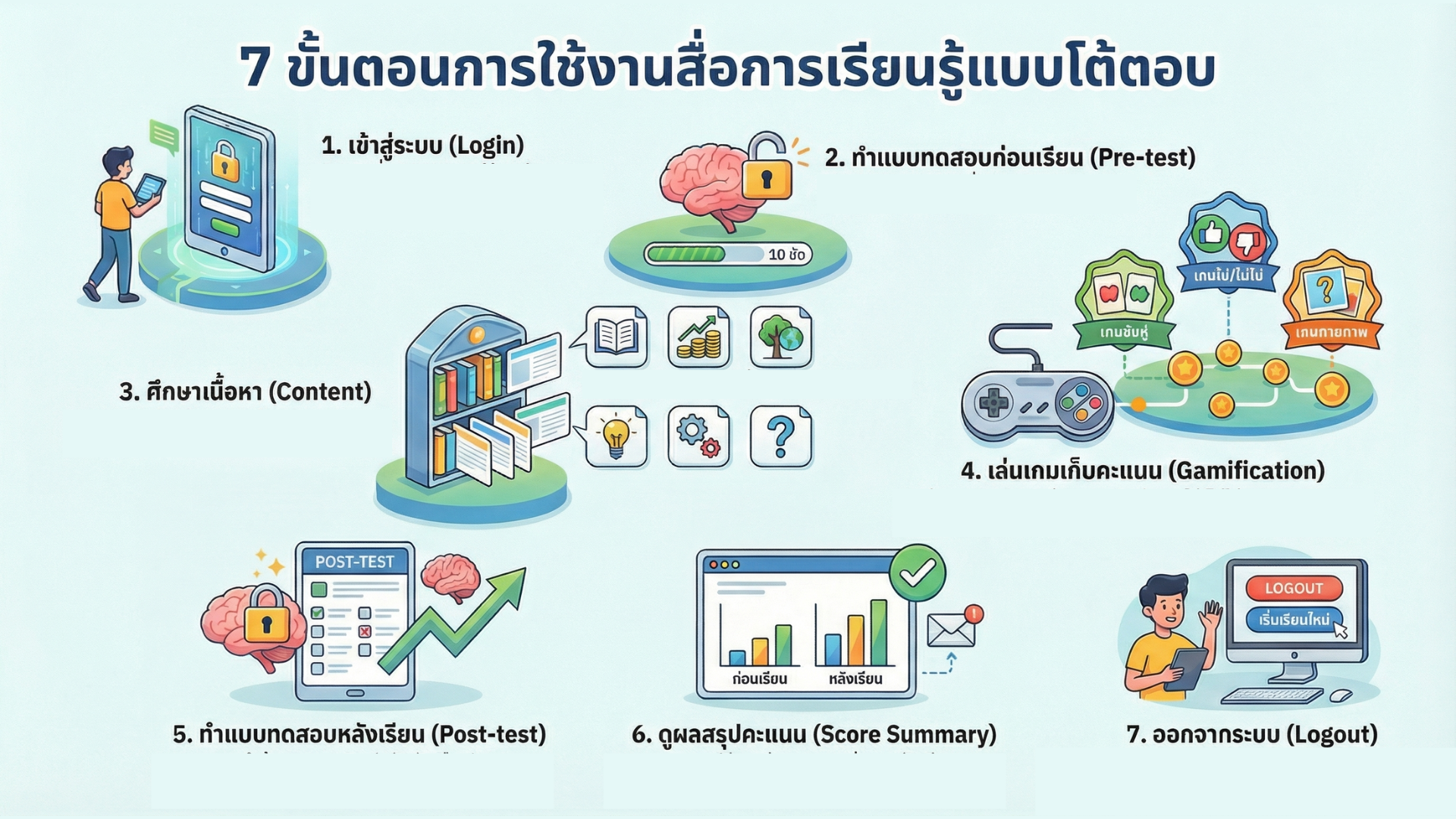 "วิธีการใช้งานสื่อการเรียนรู้ (สำหรับผู้เรียน) 1. การเข้าสู่ระบบ (Login) ให้นักเรียนกดลิงก์ (Web App URL) เพื่อเข้าสู่หน้าเว็บไซต์ พิมพ์ ""ชื่อ-นามสกุล"" ของตนเองลงในช่องว่างให้ถูกต้อง แล้วกดปุ่ม ""เข้าสู่บทเรียน"" ข้อควรระวัง: ชื่อนี้จะถูกนำไปบันทึกในใบคะแนน (Google Sheets) ของครู ดังนั้นต้องพิมพ์ให้ชัดเจน 2. การทำแบบทดสอบก่อนเรียน (Pre-test) เมื่อเข้าสู่หน้าเมนูหลัก นักเรียนต้องเลือกทำ ""1. แบบทดสอบก่อนเรียน"" เป็นอันดับแรก (เมนูอื่นจะยังกดไม่ได้) ทำข้อสอบจำนวน 10 ข้อ (จับเวลาข้อละ 60 วินาที) เมื่อทำครบ ระบบจะบันทึกคะแนนและปลดล็อกเมนูถัดไปให้ 3. การศึกษาเนื้อหา (Content) เข้าสู่เมนู ""2. เนื้อหาความรู้"" ศึกษาบัตรความรู้ทั้ง 6 ประเภท (การศึกษา, สารสนเทศ, การเงิน, สิ่งแวดล้อม, การเกษตร, การแพทย์) เมื่ออ่านจบ ให้กดปุ่มด้านล่างเพื่อไปเริ่มเล่นเกม 4. การปฏิบัติกิจกรรมผ่านเกม (Gamification) ระบบจะบังคับให้เล่นทีละด่าน เพื่อเก็บคะแนนสะสม: เกมที่ 1 (จับคู่): ลากป้ายชื่อประเภทเทคโนโลยี ไปวางในช่องว่างให้ตรงกับคำอธิบาย (ต้องถูกอย่างน้อย 6 ข้อจึงจะผ่าน) เกมที่ 2 (ใช่/ไม่ใช่): วิเคราะห์โจทย์แล้วเลือกว่าข้อความนั้น ""ใช่"" หรือ ""ไม่ใช่"" เกมที่ 3 (ทายภาพไอคอน): ดูรูปไอคอนปริศนา แล้วทายว่าเป็นเทคโนโลยีด้านใด 5. การทำแบบทดสอบหลังเรียน (Post-test) เมื่อผ่านด่านเกมทั้งหมด เมนู ""6. แบบทดสอบหลังเรียน"" จะปลดล็อก ทำข้อสอบ 10 ข้อ (ชุดเดิมแต่สลับช้อยส์) เพื่อวัดผลการพัฒนา 6. การดูผลสรุป (Score Summary) ระบบจะแสดงกราฟเปรียบเทียบคะแนน ก่อนเรียน vs หลังเรียน แสดงคะแนนรวมทุกด่าน (เต็ม 50 คะแนน) และระดับคุณภาพ (เช่น ดีเยี่ยม, ผ่านเกณฑ์) สำคัญ: ในขั้นตอนนี้ระบบจะส่งคะแนนทั้งหมดไปเก็บที่เครื่องของครูโดยอัตโนมัติ 7. การออกจากระบบ (Logout) หากใช้งานบนเครื่องคอมพิวเตอร์ส่วนรวม หรือต้องการให้เพื่อนคนอื่นมาเล่นต่อ ให้กดปุ่ม ""ออกจากระบบ"" หรือ ""เริ่มเรียนใหม่"" เพื่อล้างค่าชื่อและคะแนนเก่าออก"