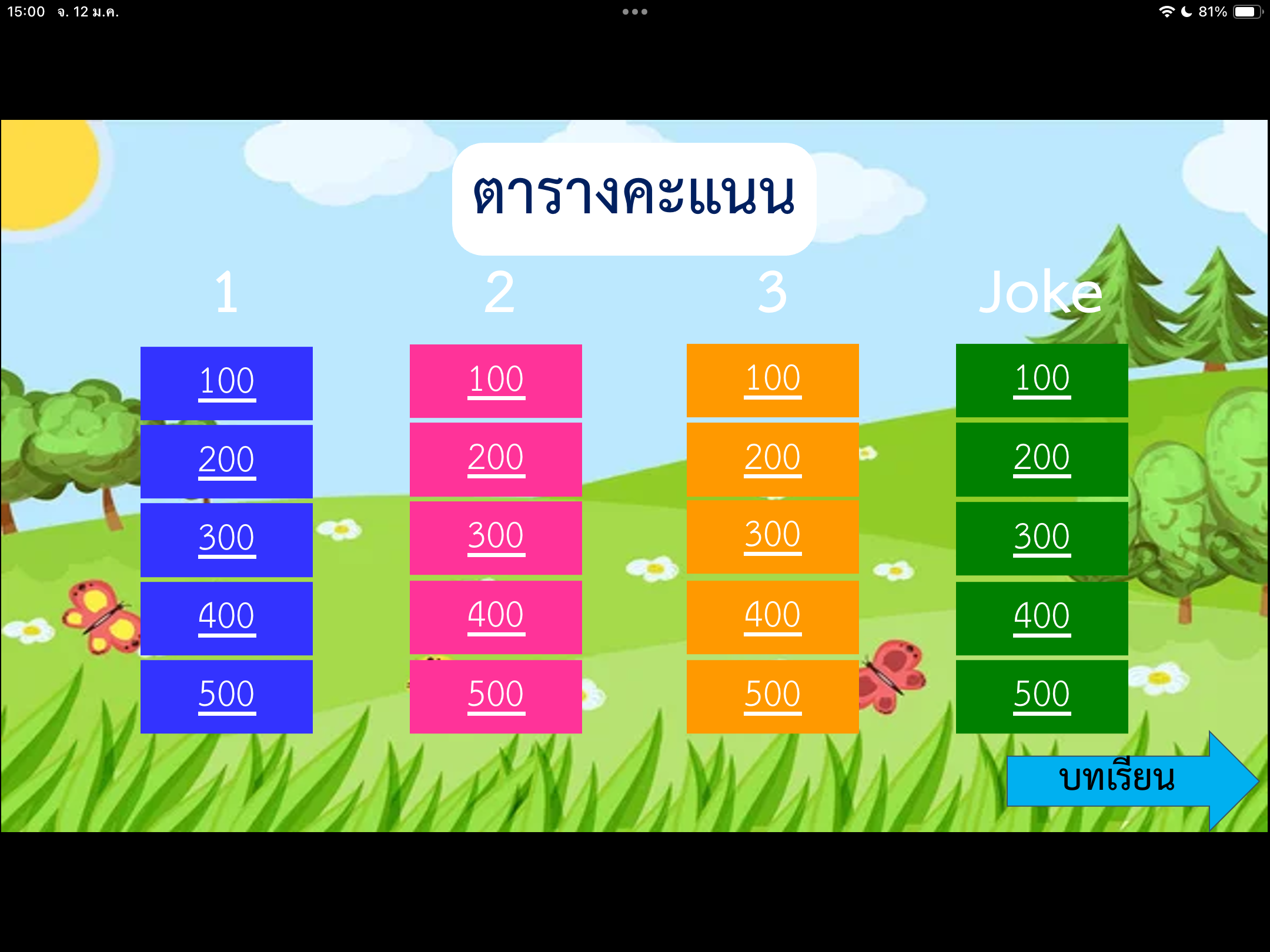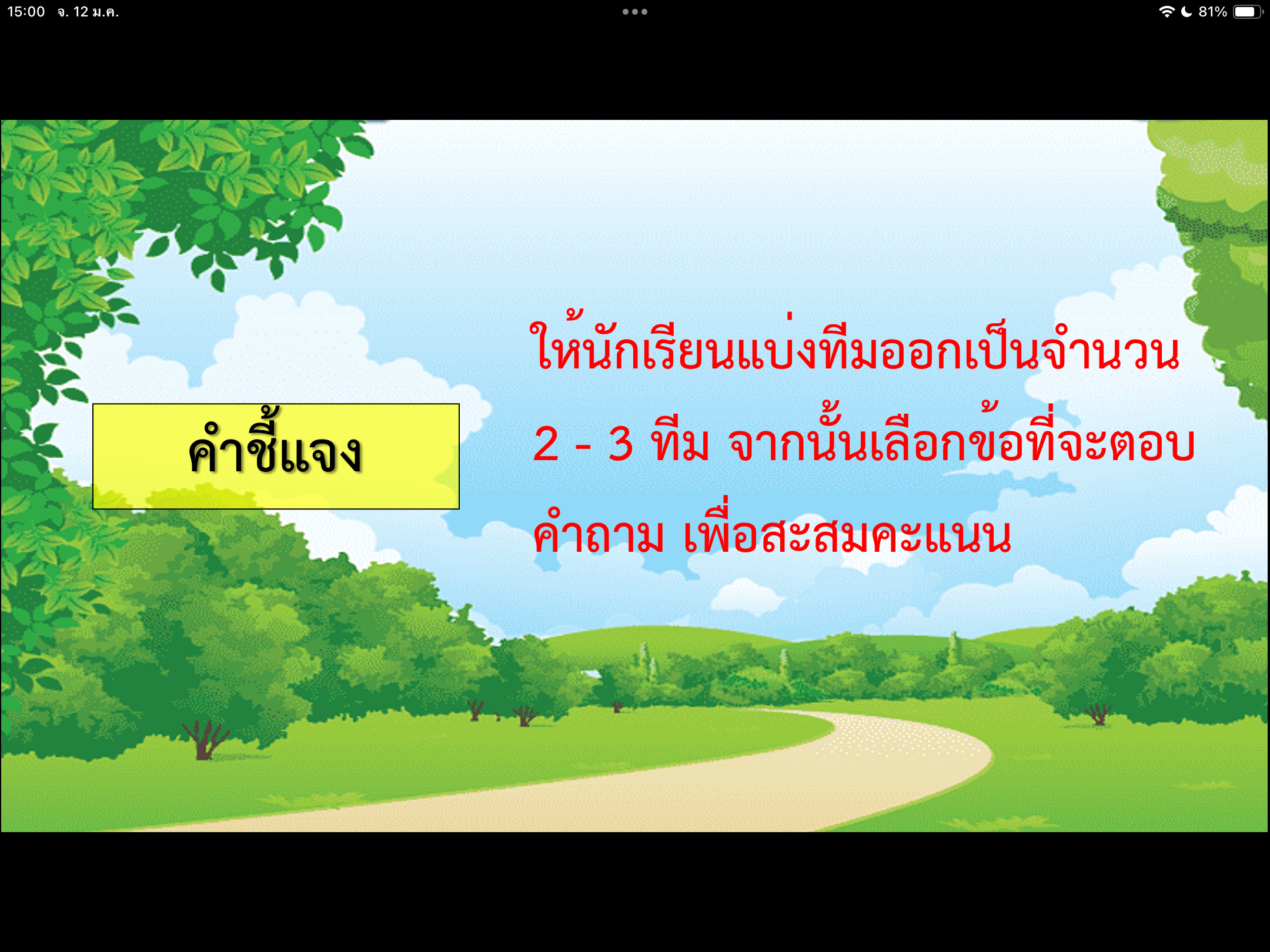 ให้นักเรียนแบ่งทีมออกเป็นจำนวน 2 - 3 ทีม จากนั้นเลือกข้อที่จะตอบคำถาม เพื่อสะสมคะแนน
